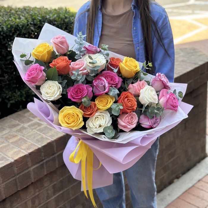 A selection of premium long-stem roses in romantic tones: creamy white, soft pink, warm coral, sunny yellow, and classic red. We use top-tier varieties like Freedom, Mondial, Tiffany, Sweet Unique, and Kahala, depending on availability.